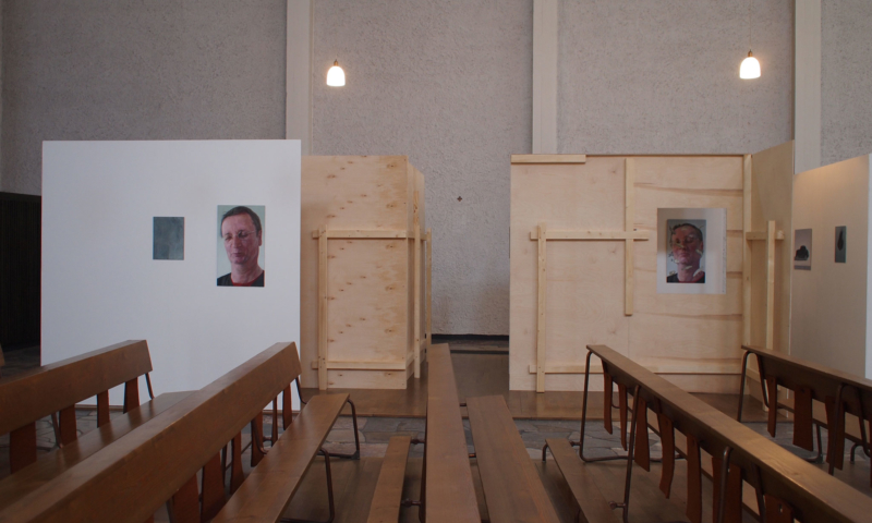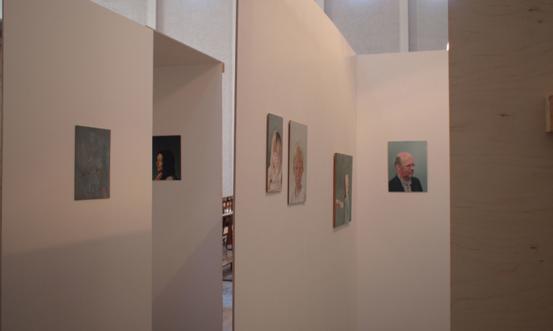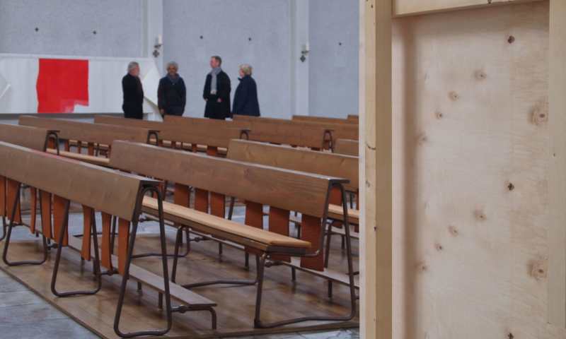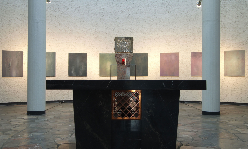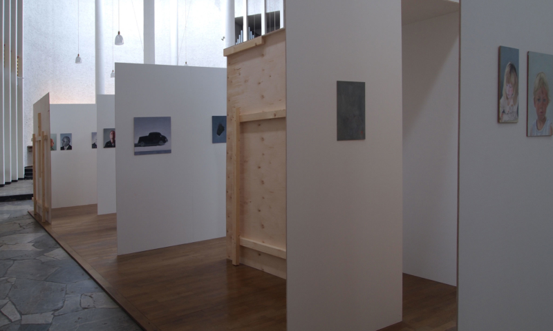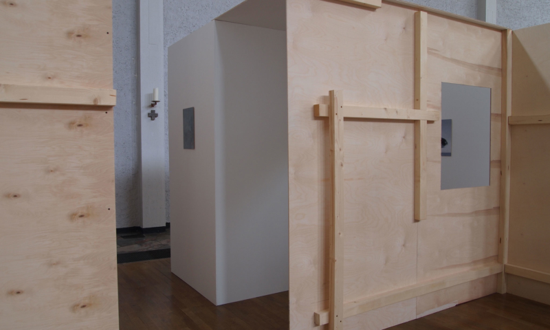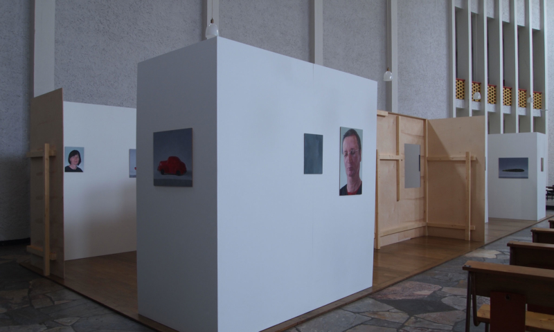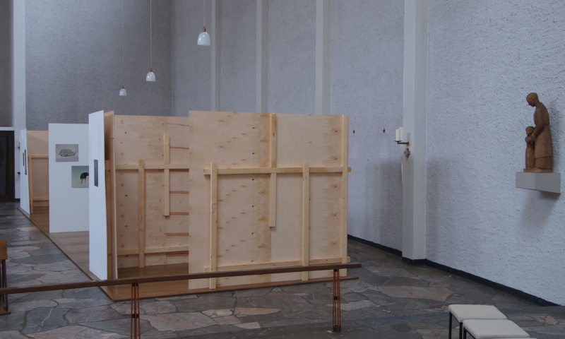die stellwände bestehen vorwiegend aus einem 90°-winkel im längenverhältnis 2:1, mal als außenecke, mal als innenecke. jede wand hat somit vorder-und rückseite und sie sind so angeordnet, dass sie räume wie in einem haus evozieren: mit durchgängen und durchblicken, aber auch mit ausblicken auf konstruktive rückseiten, auf das skelett, das tragende. der betrachter kann in einen dialog mit den kleinformatigen bildern treten, ungeachtet der dimension des umgebenden kirchenraums – gleichzeitig sieht er auch die »Intimität« der tragenden strukturen.