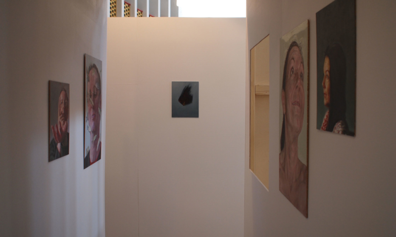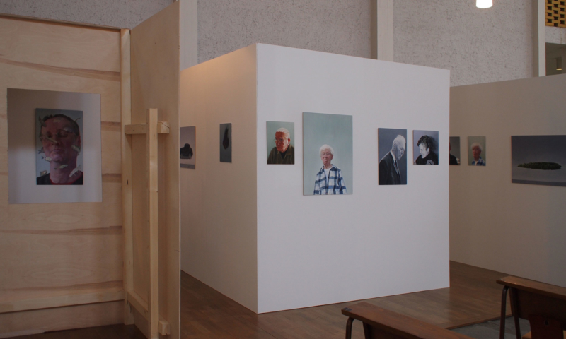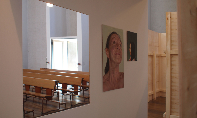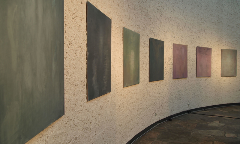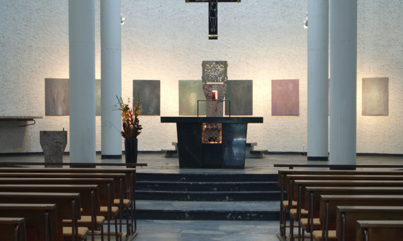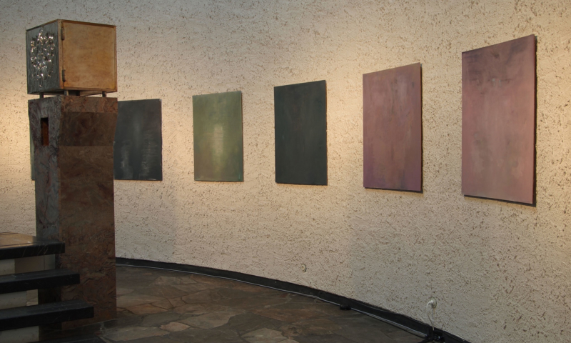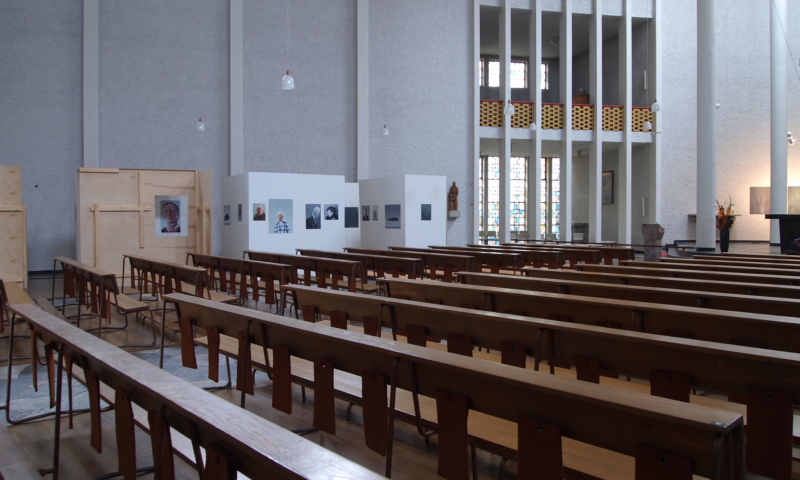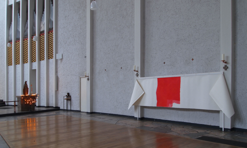 die stellwände bestehen vorwiegend aus einem 90°-winkel im längenverhältnis 2:1, mal als außenecke, mal als innenecke. jede wand hat somit vorder-und rückseite und sie sind so angeordnet, dass sie räume wie in einem haus evozieren: mit durchgängen und durchblicken, aber auch mit ausblicken auf konstruktive rückseiten, auf das skelett, das tragende. der betrachter kann in einen dialog mit den kleinformatigen bildern treten, ungeachtet der dimension des umgebenden kirchenraums – gleichzeitig sieht er auch die »Intimität« der tragenden strukturen.