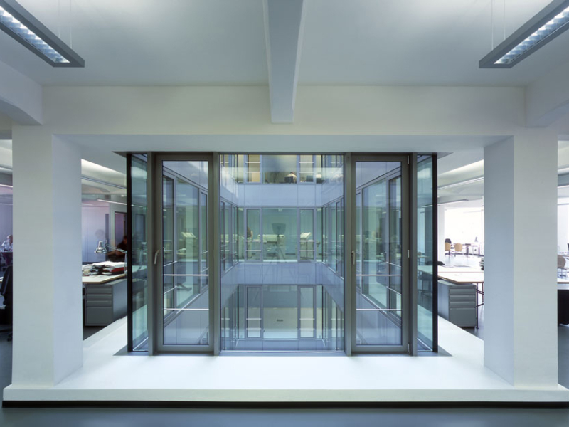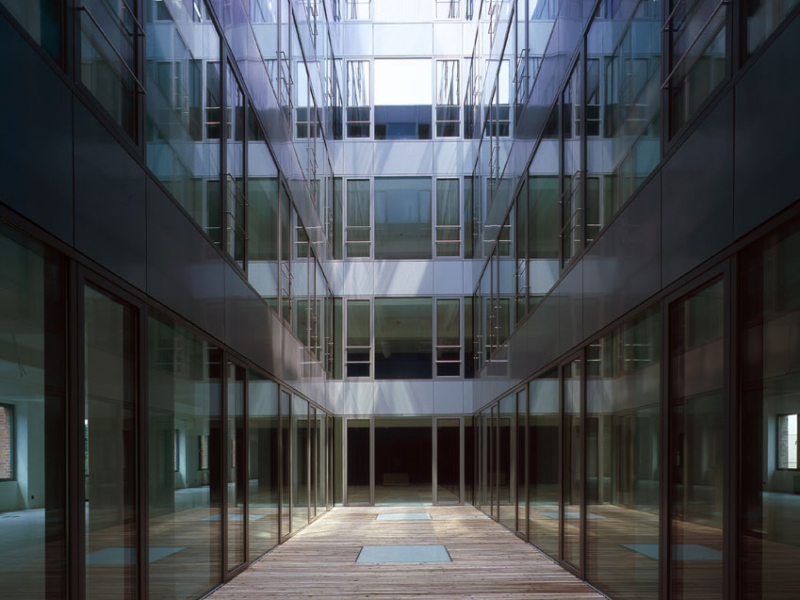 das dach wurde durch einen 2-geschossigen gläsernen aufbau in stahlbetonkonstruktion ersetzt, der formal eine eigenständige einheit bildet, die proportionen der fassaden neu strukturiert und dem gebäude eine charakteristische prägung verleiht. die gegensätzlichkeit der materialien zwischen alt/neu und stein/glas lenkt die aufmerksamkeit auf den vorhandenen altbau und gibt dem gebäude signifikanz. jade: standort für visionäre, unternehmer und erfinder.