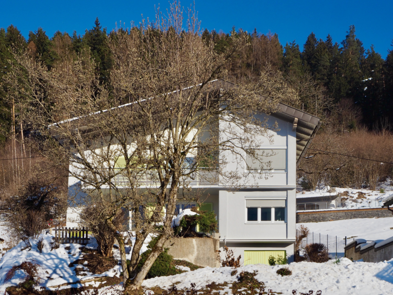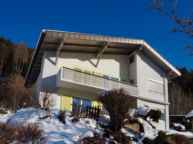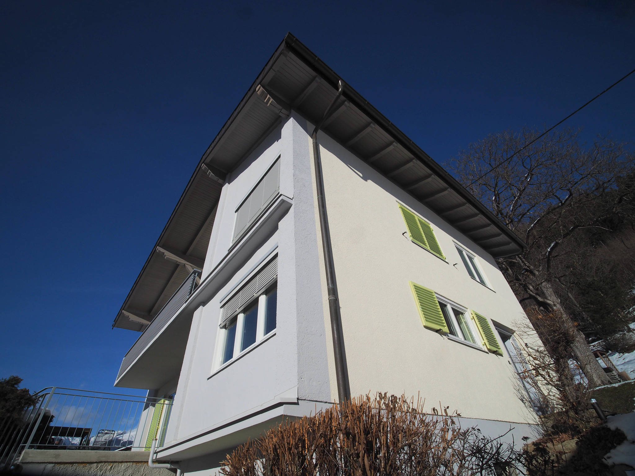 die außenfassaden wurden neu gestaltet: das rustikale balkongeländer wurde durch eine filigrane lamellenstruktur mit handballenauflage ersetzt. eine veränderung des vertikalen fassadenteils durch das einfügen von geschosshohen holzrahmen mit französischen fenstern wurde vorbereitet und genehmigt, jedoch nicht ausgeführt. das holzwerk der sichtbaren dachkonstruktion wurde farblich neu gefasst, die klappläden gereinigt und neu lackiert. außerdem wurde an teilen der außenfassade ein wdvs aufgebracht, sowie eine kellerdeckendämmung.