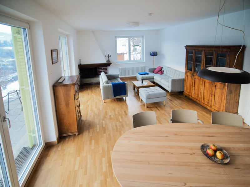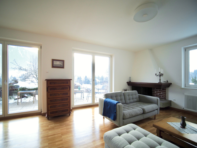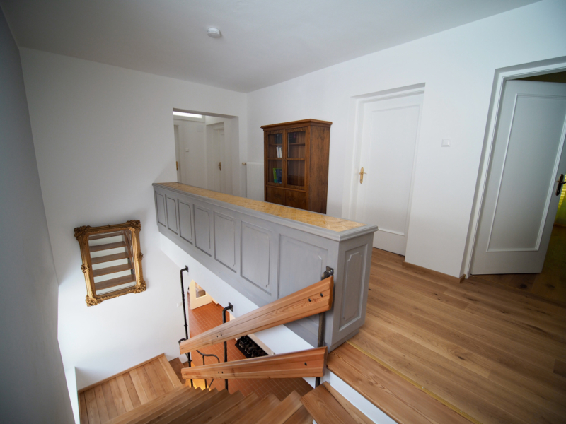 die böden in den zimmern des obergeschosses sowie dem flur wurden neu hergestellt, eiche-landhausdielen incl. trockenestrich. wände und decken wurden aufwändig gespachtelt und neu gestrichen, die fenster getauscht. das parkett des wohnbereichs im erdgeschoss wurde an schadhaften stellen ausgebessert und neu versiegelt. es wurden diese beläge mit den fliesen der bäder und der küche neu aufeinander abgestimmt, womit geradlinige elemente in den charakter des hauses integriert werden konnten.