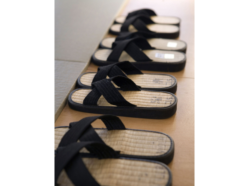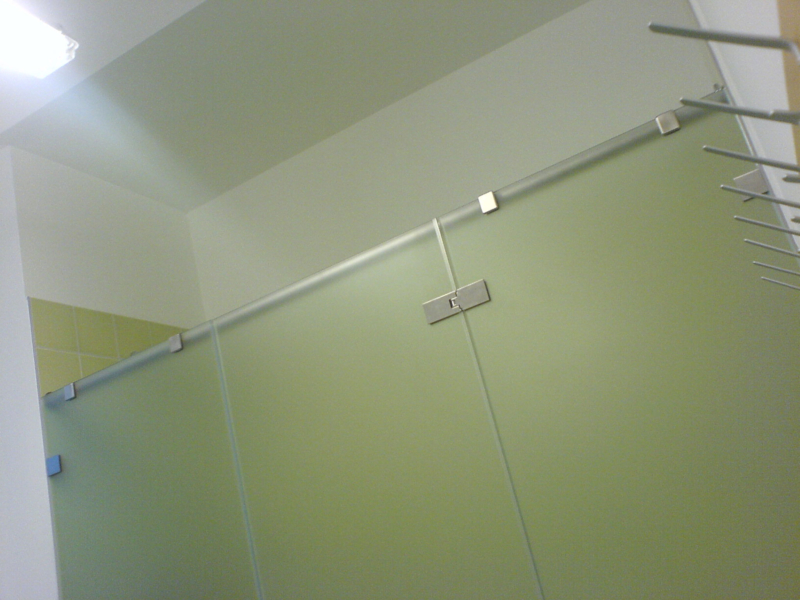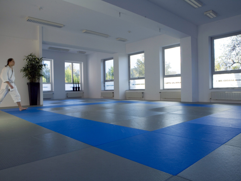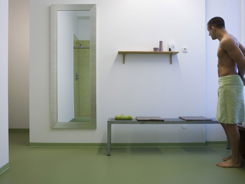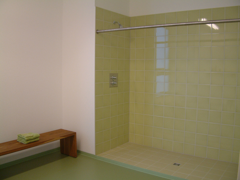 die kombinierten umkleiden und duschen symbolisieren mit ihrer lichten grünen materialität der bodenbeläge und glasierten wandfliesen die von fruchtbarer feuchtigkeit durchdrungenen grünen japanischen hausgärten. in jedem der beiden umkleiden befindet sich hinter einer milchglasabtrennung zwei duschen, deren lindgrüne fliesen farblich abgestimmt sind auf den grünen naturkautschuk-boden der umkleide. flure und büro sind mit grauem kautschukboden ausgestattet.