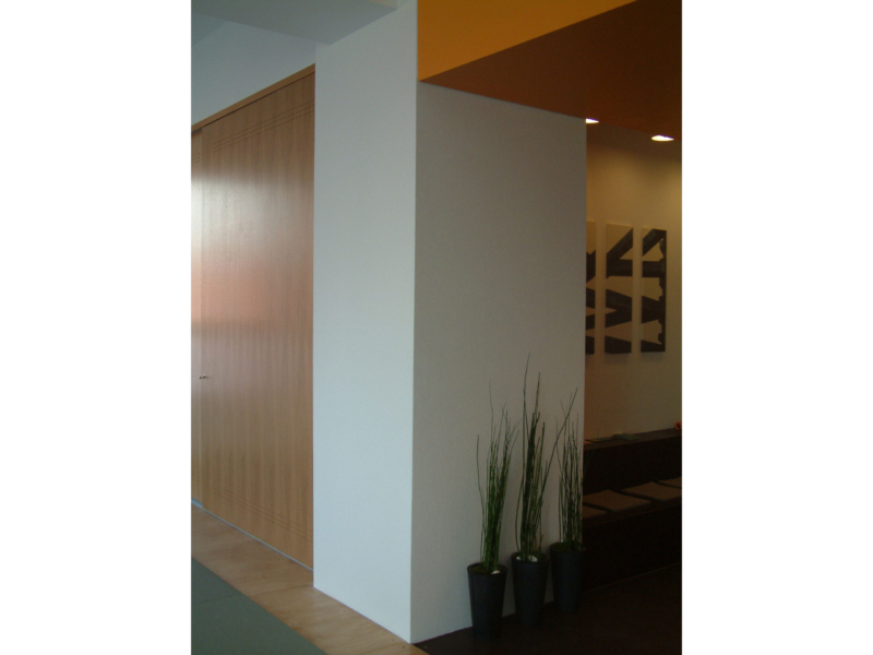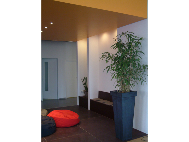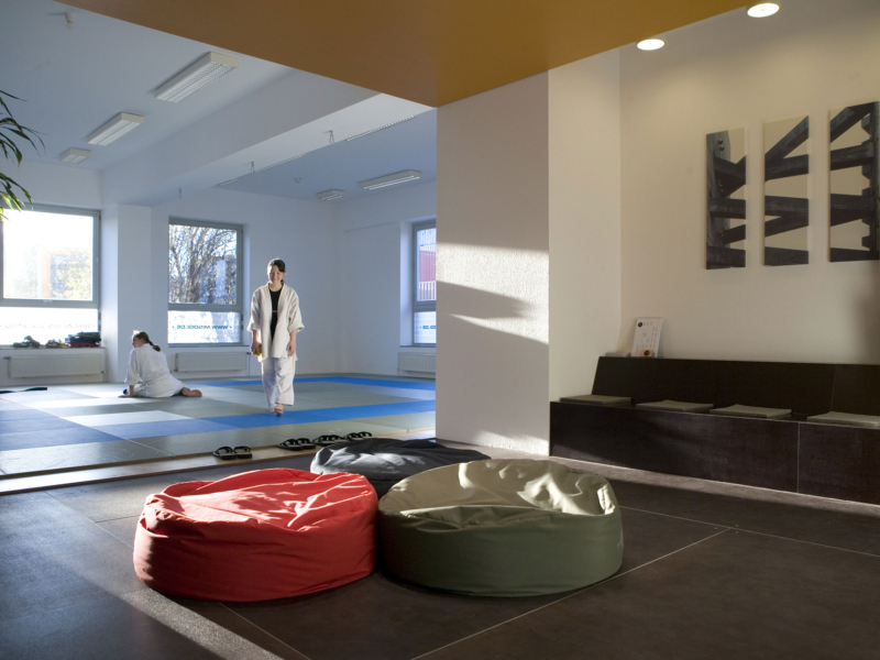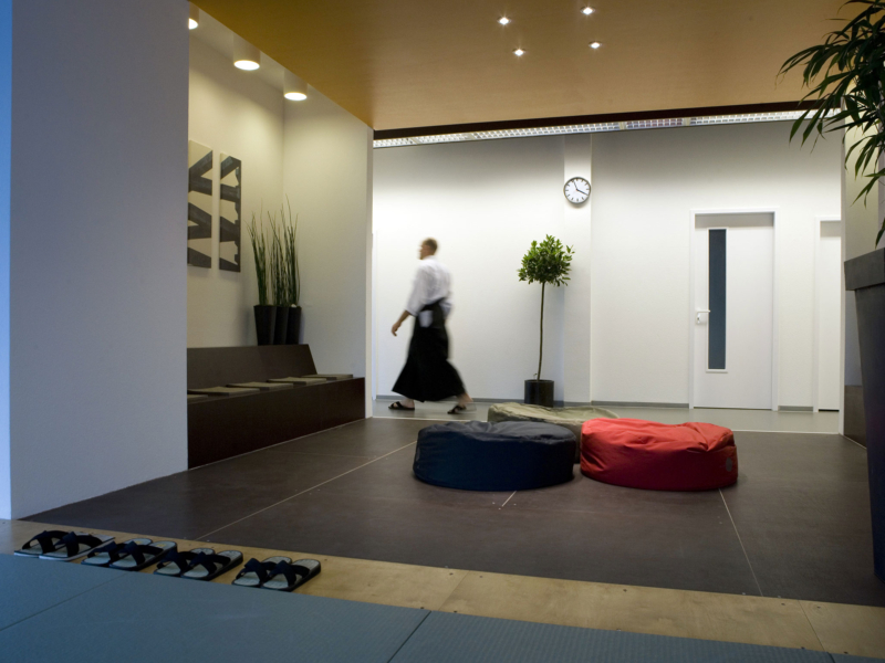 dem mattenbereich (dojo) benachbart ist ein aufenthaltsbereich, dessen quadratische grundform durch ein abgehängtes deckenelement in der höhe auf ein angenehmes maß begrenzt wird. das deckenelement nimmt das orange der corporate farbe von »misogi pro« auf. der dunkle holzboden faltet sich an zwei seiten zu sitzbänken hoch. er hat eine teilung, die an den bodenbelag aus tatamis eines klassischen japanischen wohnraums erinnert.