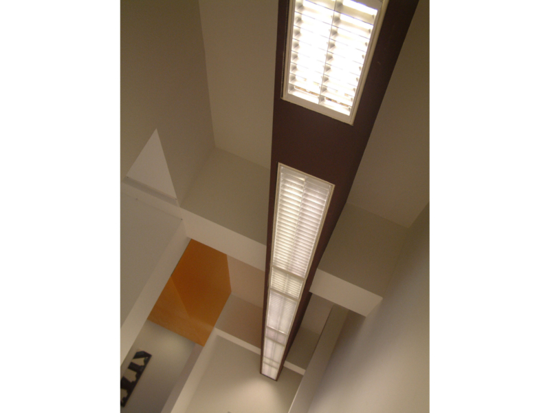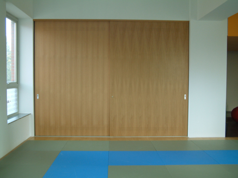 das schwert ist abstrahiert als lichtband in den flur gehängt, in der farbigkeit schwarzrot wie der dunkle holzboden gehalten. ein weiteres raumprägendes element, welches durch seine einfache schlichtheit besticht, ist eine ca. 13 qm große zweiteilige holz-schiebetüranlage mit echtem eichefurnier, hinter der alle sportgeräte verschwinden. ein eiche-mosaikparkett prägt auch den fitnessraum.
