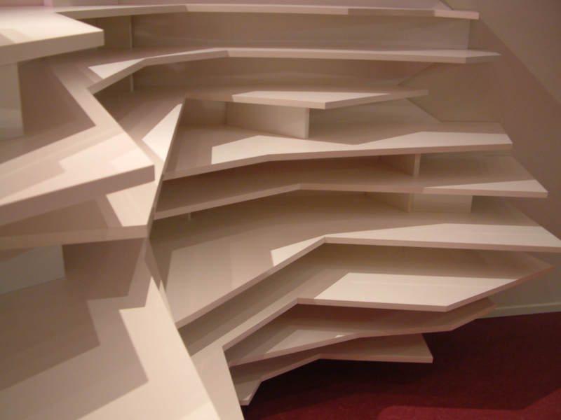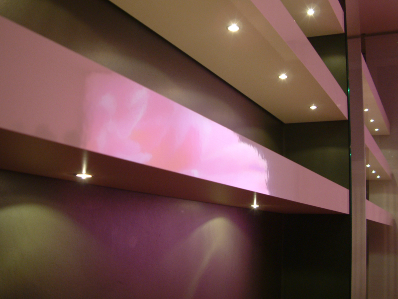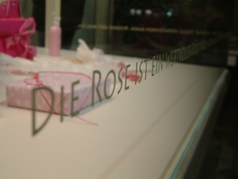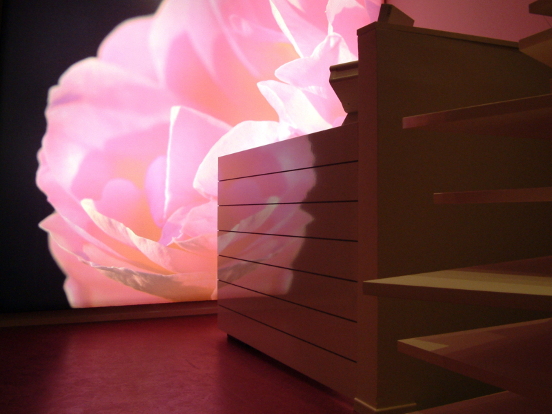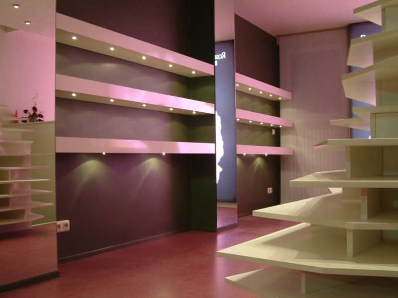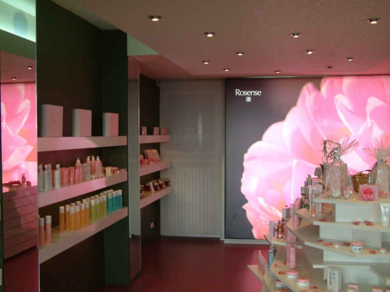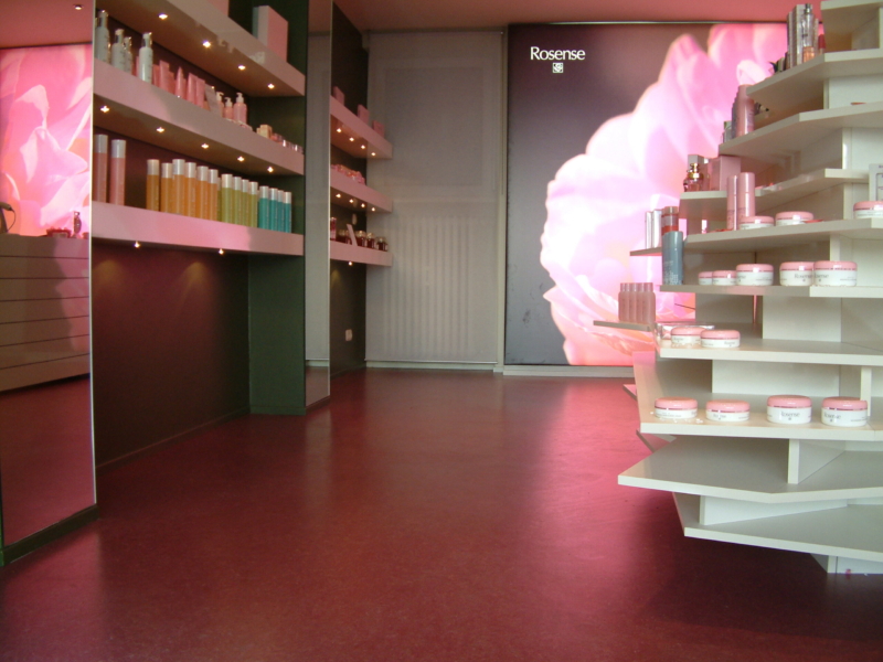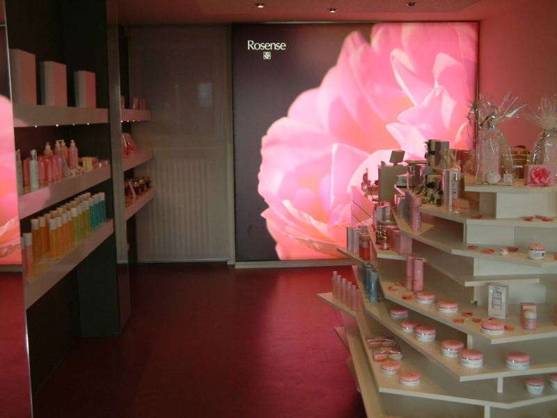 in der realisierung unterstützt ein hinterleuchtetes 7 qm großes rosenbild das beleuchtungskonzept. der ganze laden wird in wildrosen-farbenes licht getaucht. halogen-möbeleinbauspots lenken die konzentration der kunden auf die produkte. die möbel sind aus hochglanz-hpl beschichteten holzplatten in elfenbeingetöntem kalkweiß gefertigt. der marmorierte linoleum bodenbelag von armstrong dlw marmorette pur in blackberry purpur nimmt die farben der rosenblüten auf.