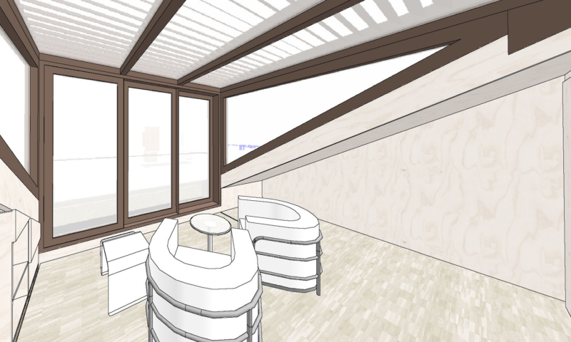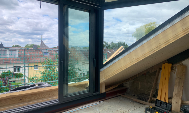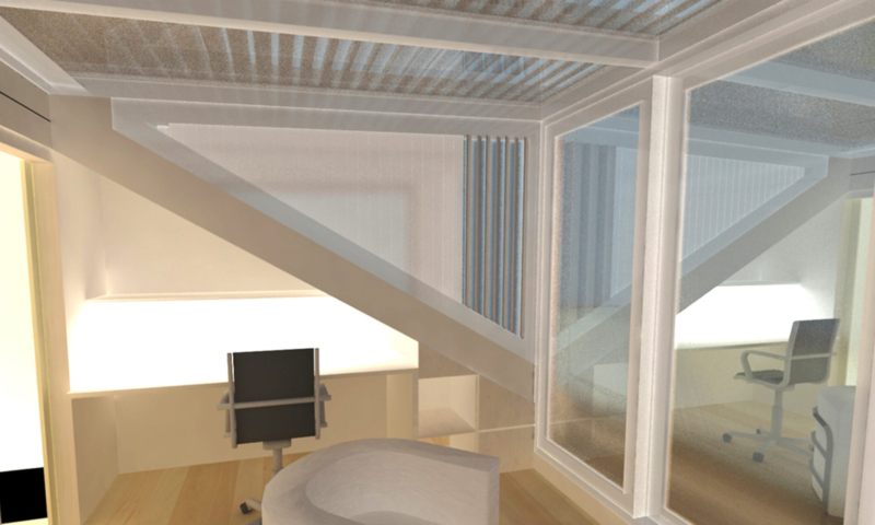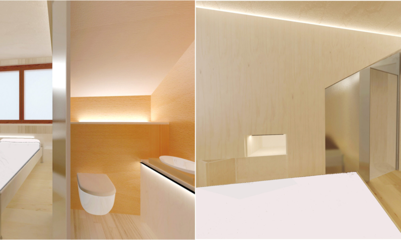 das dachgeschoss wird durch ein mittig eingestelltes duschbad in zwei bereiche unterteilt, den chlafbereich nach osten mit einer klassischen gaube, und einen privaten wohnbereich mit der glasgaube und einer 3-teiligen schiebetüranlage nach westen. in den schlafbereich sind ein wc, ein schrankraumbereich sowie ein homeoffice arbeitsplatz integriert. ein weiterer arbeitstisch ist im wohnbereich unter einer dachschräge angeordnet.