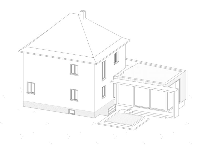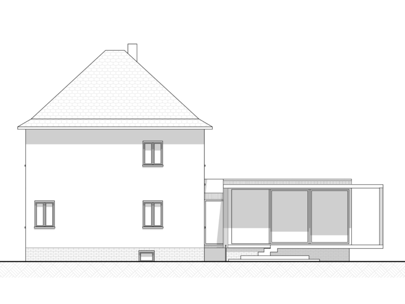 es war vorgesehen, den anbau in elementierter vorgefertigter holzbauweise zu errichten. der kellerabgang sollte erneuert werden und einen weiteren abstellbereich für gartengeräte erhalten. das projekt wurde nicht weiter verfolgt.