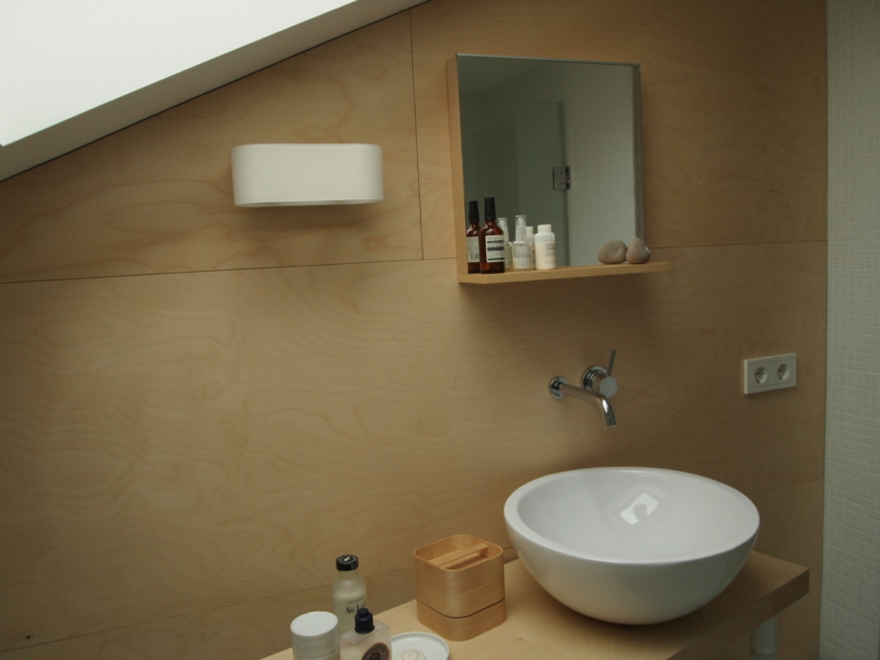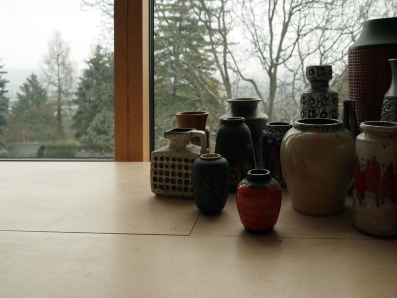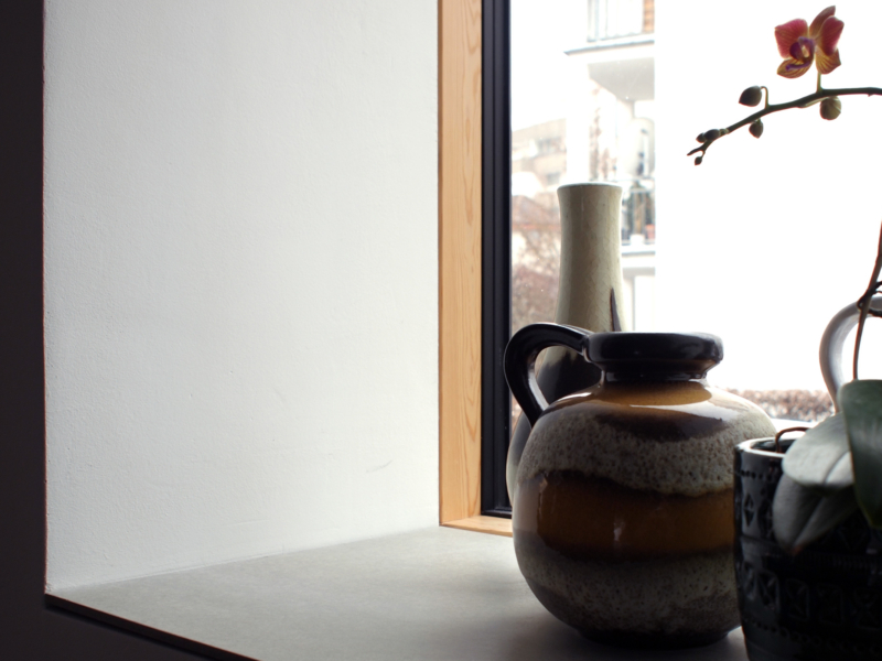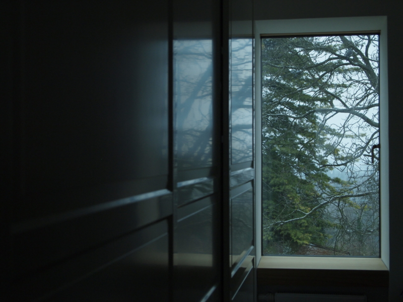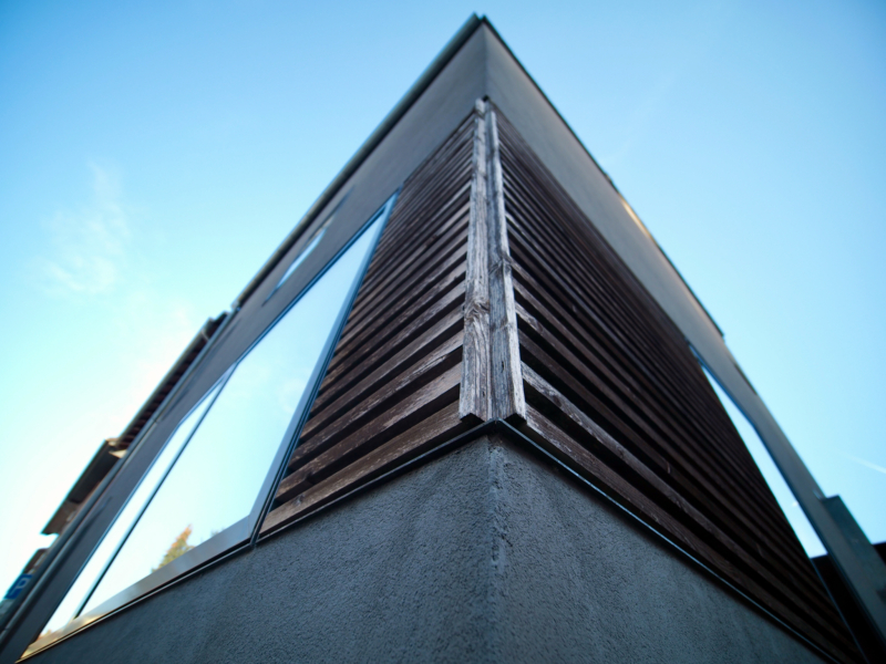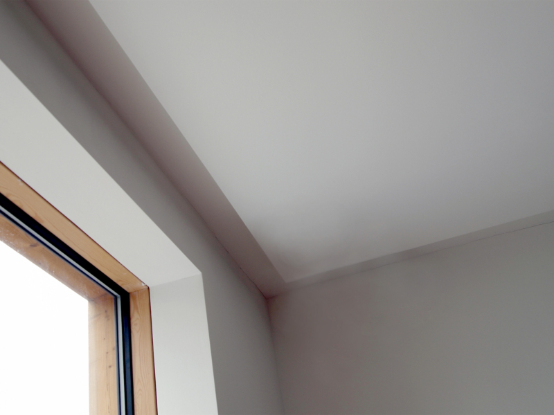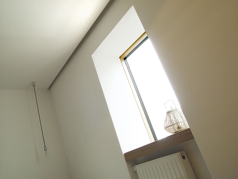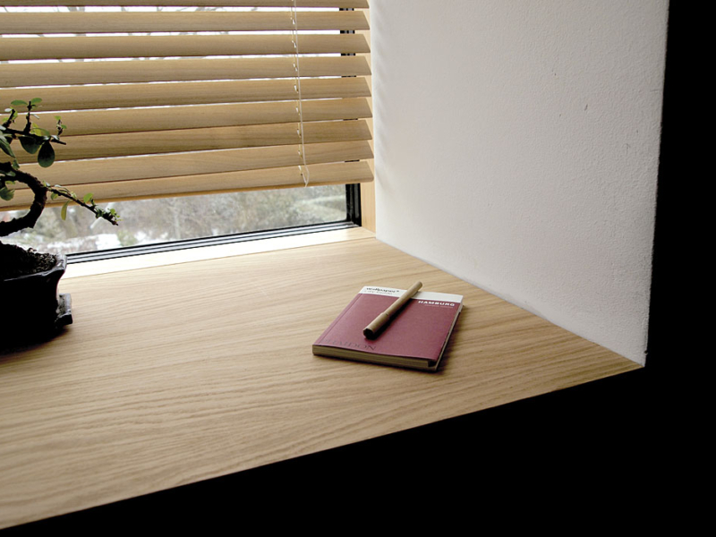 das dachgeschoss erhielt eine geschosshohe gaube nach osten mit blick in das maintal. bei den fenstern handelt es sich um nach außen öffnende alu/holz-konstruktionen, die in einer eben mit der putzfassade abschließen. auf diese weise ließen sich vorhandene und neue fensteröffnungen maximal für die belichtung (glasmaß) nutzen, die tiefen fensterleibungen erweitern die innenräume visuell.
