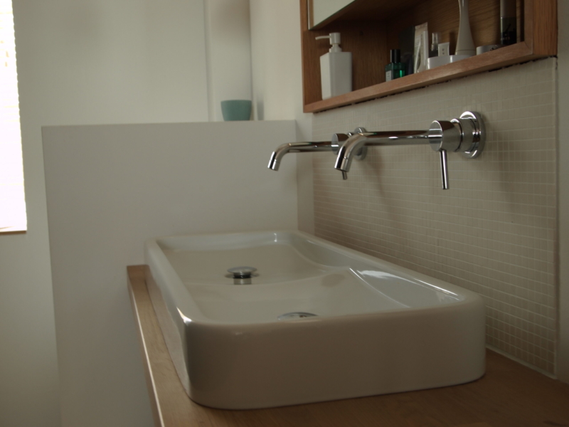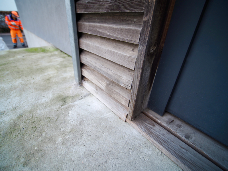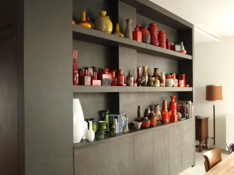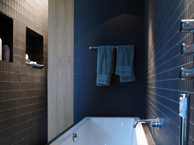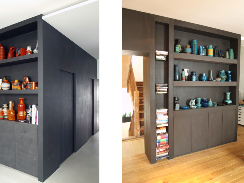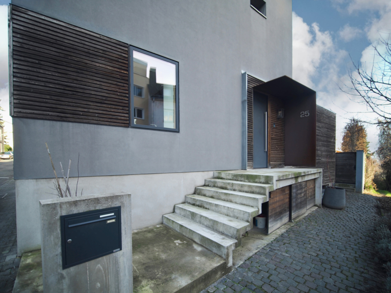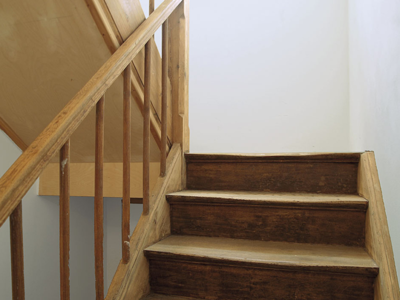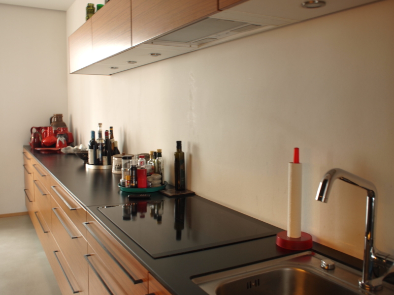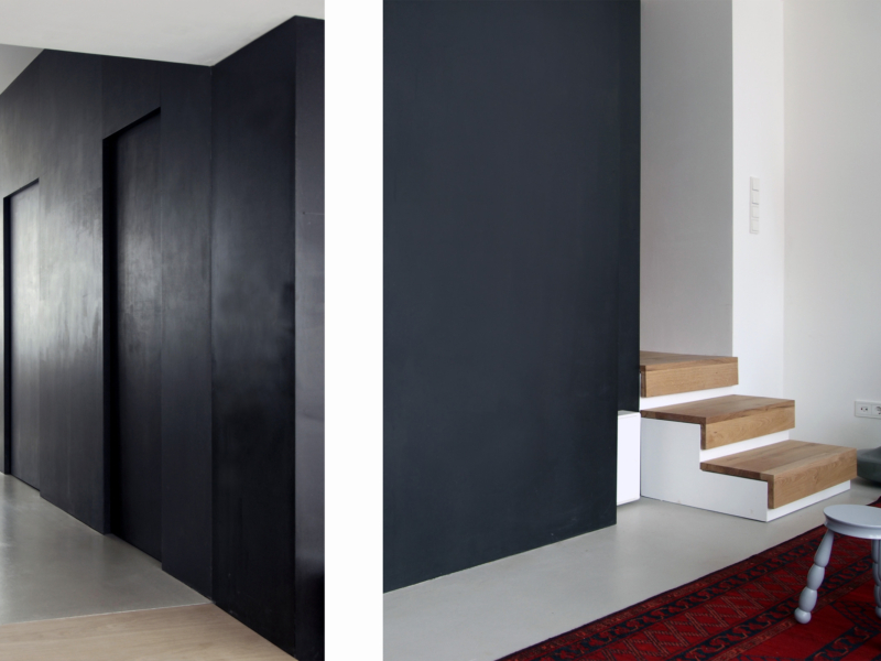das treppenhaus bildet über 2 wohngeschosse einen in den umgebenden wohnräumen ablesbaren kern. er ist zu diesen räumen teils als möbel, teils als raumeinheit (badewanne, dusche, küchenzeile) in antrazitfarbenen mdf bzw. fliesen ausgebildet.