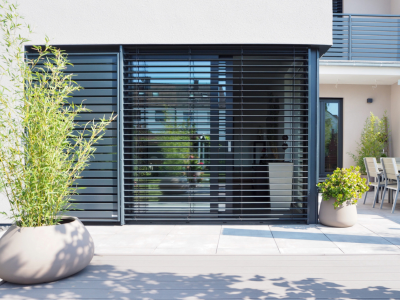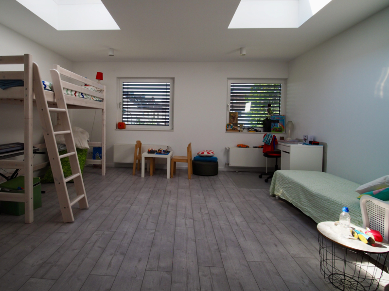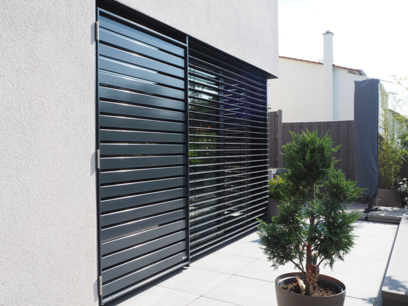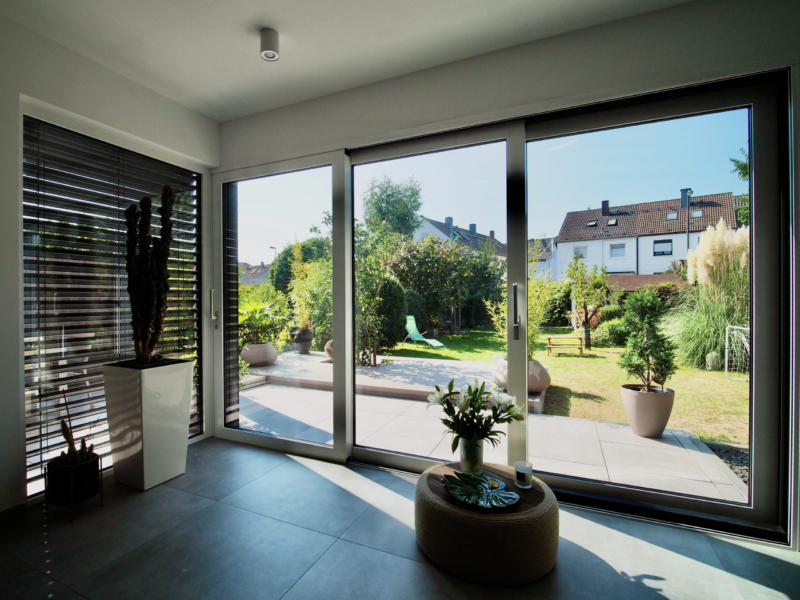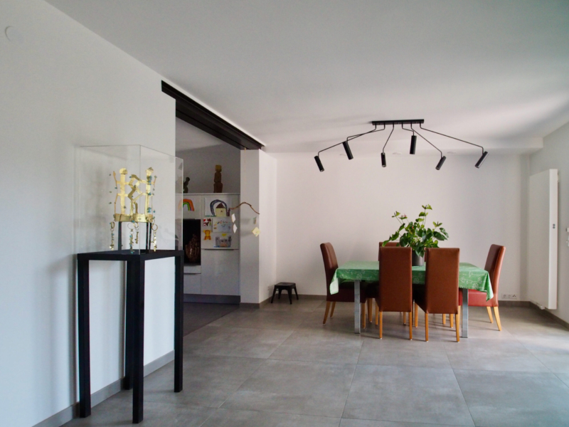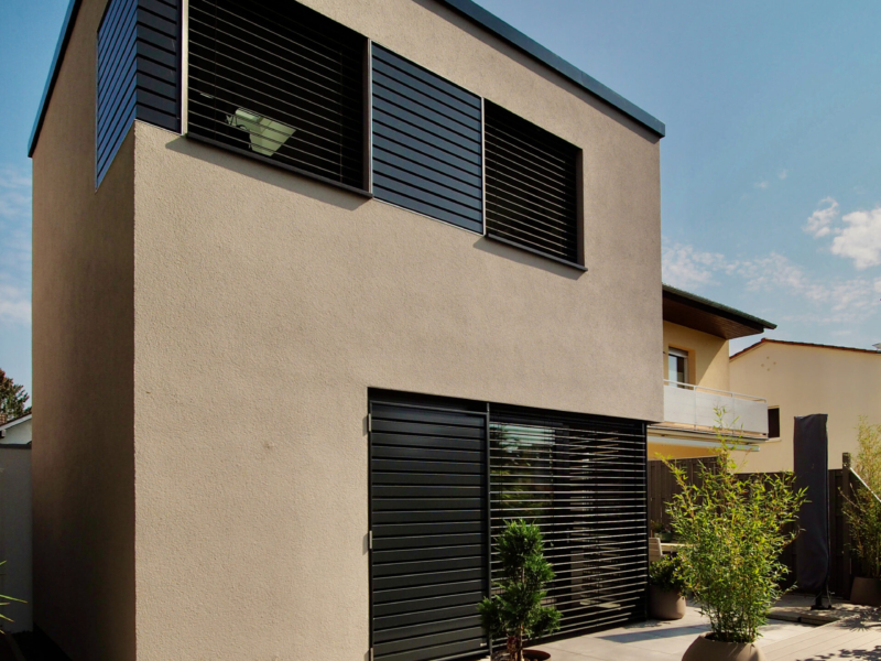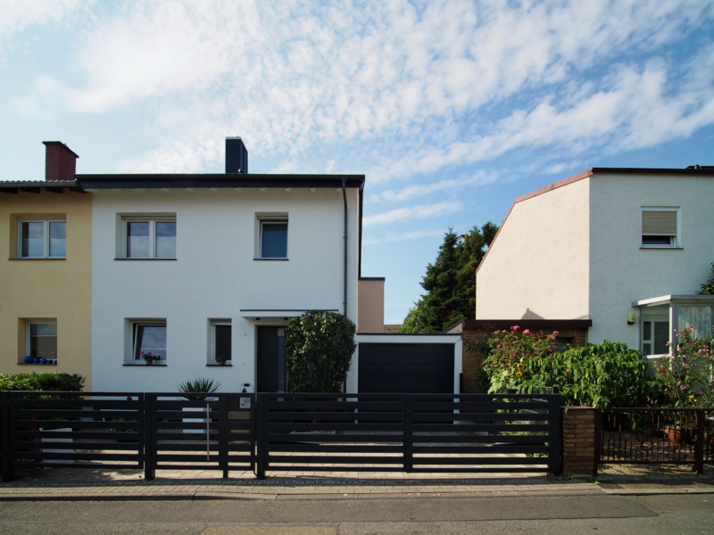 im erdgeschoss entsteht aus der verbindung vom altbau 2 stufen runter ein großer fließender wohnraum, der eine ebenengleiche verbindung zu terrasse herstellt. eine dreiteilige schiebetüranlage mit über-eck-verglasung leitet den blick vom innenraum in den offenen garten. die außenstehende eckstütze ist gestalterisch in die fensterkonstruktion eingebunden, sodass eine bandartige fenstergestaltung entsteht, die im obergeschoss spiegelsymmetrisch aufgenommen wurde. diese wirkung wird auch durch die metallelemente in der fassade erzeugt, die die sonnenschutz-lamellenjalousien imitieren und die gestaltung des balkongeländers und vom grundstückszaun aufnehmen.