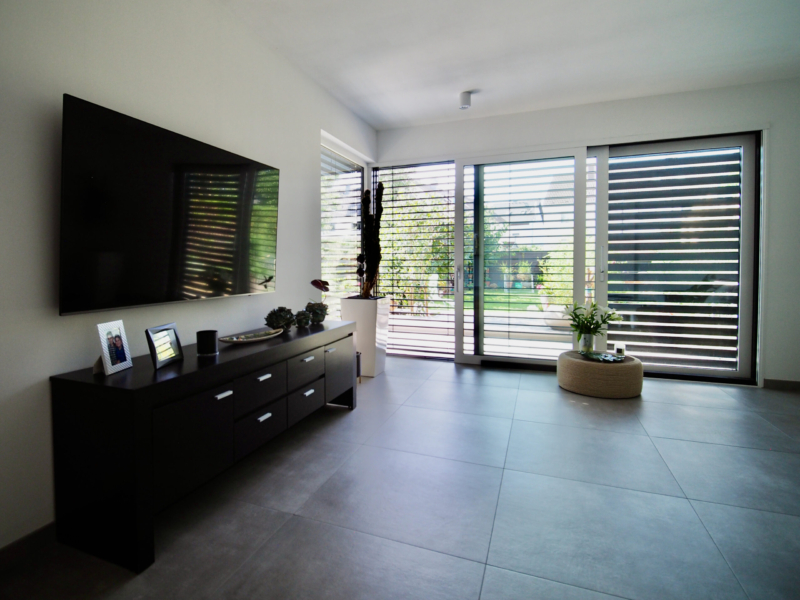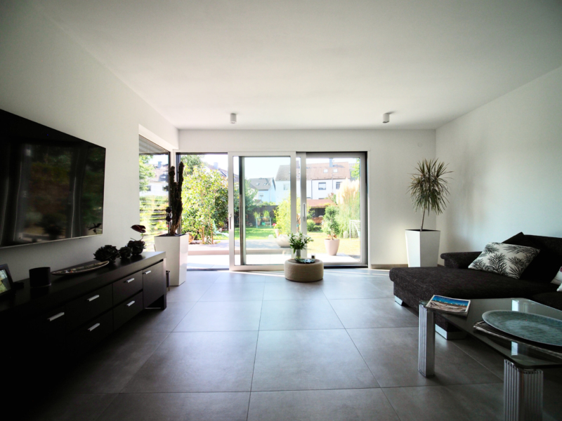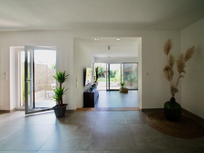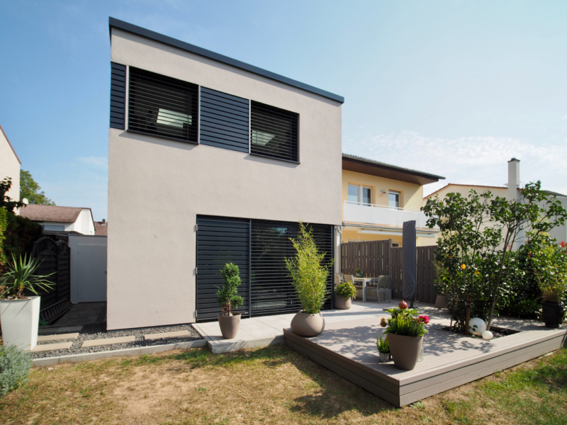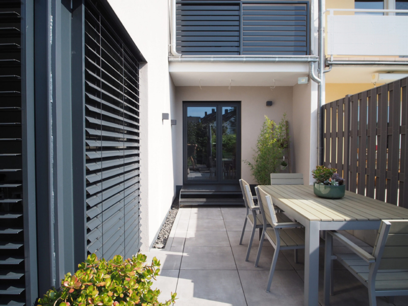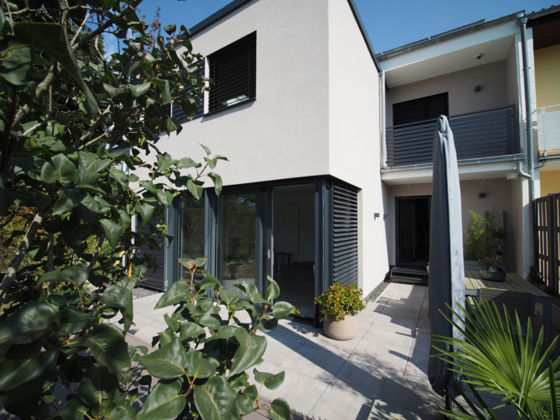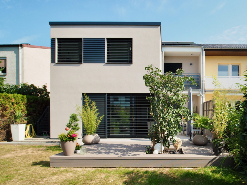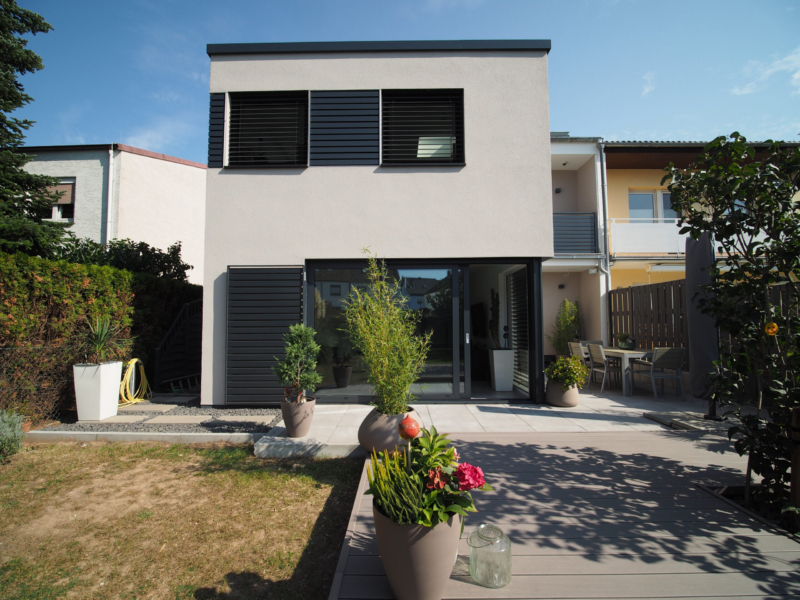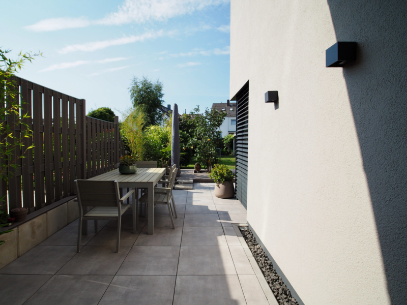 die wohnhauserweiterung wird ergänzt durch eine abgestufte außenraumgestaltung seitlich und rückwärig zum garten, mit großformatigem keramischen terrassenbelag und einem abgesetzten holzdeck als übergang zum grün gestalteten garten.