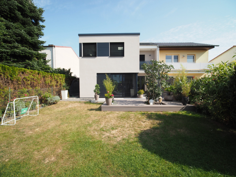 für den anbau wurde ein teil des gartenseitigen balkons am altbau entfernt. der kubische anbau greift harmonisch in den garten aus.